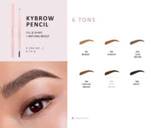 • Possui um lápis rosa pálido com o logotipo da Kylie em prata. Dupla extremidade, vem com uma ponta retrátil ultrafina para traços ultraprecisos semelhantes a pelos, sobrancelhas perfeitamente preenchidas e remodeladas e um spoolie integrado suave (para arrumar as sobrancelhas no lugar, enquanto mistura a textura para um acabamento de aparência natural).