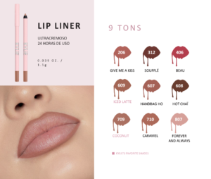 • Lip Liner*: combinação única de ceras veganas que amam a pele para um uso confortável.