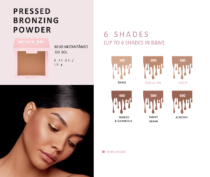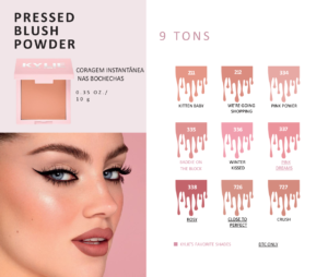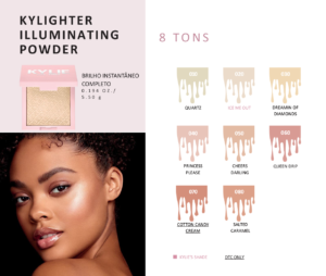 • Apresenta um compacto rosa pálido com o logotipo de Kylie em prata brilhante.